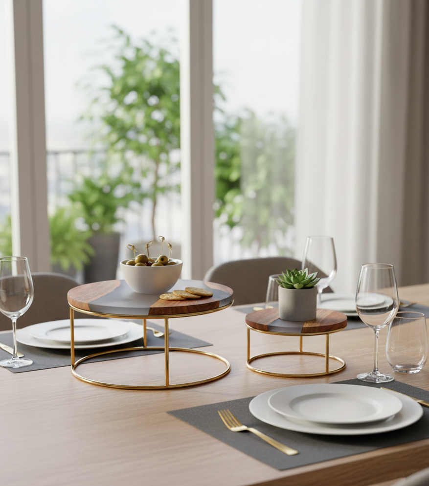 This beautifully handcrafted riser is perfect for elevating your table styling. The natural wood grains, paired with smoky resin art, create a stunning surface that stands out effortlessly. Its compact metal base (approx. 8–9 cm height) makes it ideal to use as: