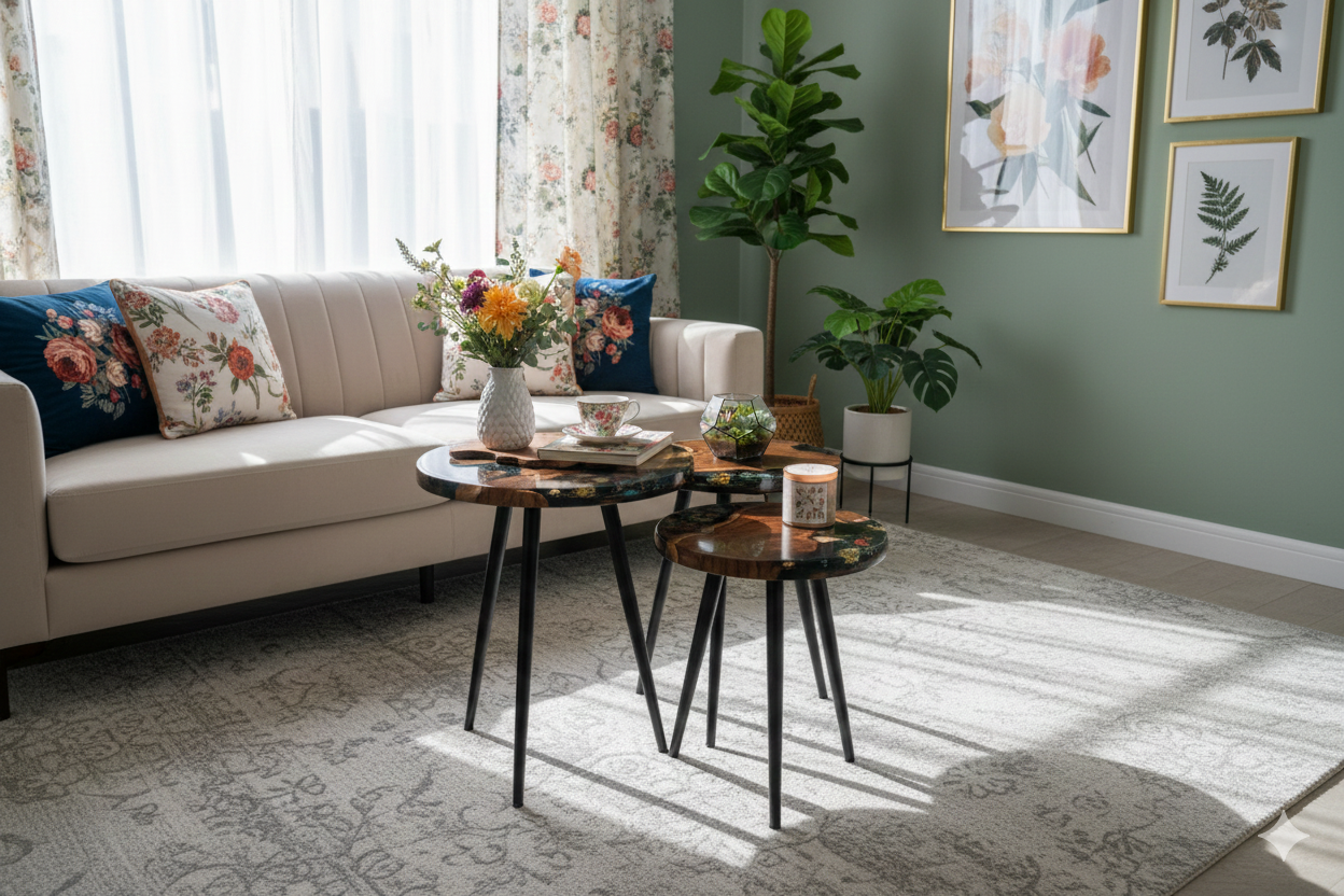 Black Floral Epoxy & Natural Wood Nesting Tables – Set of 3